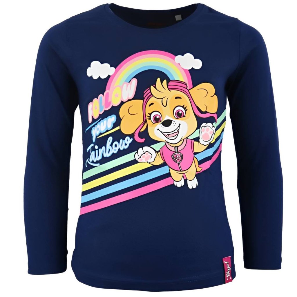 Dívčí tričko s dlouhým rukávem s potiskem psích hrdinek Skye a Everest z oblíbené pohádky Tlapková patrola. Na přední straně trika kromě obrázku najdete i nápis Follow your rainbow.